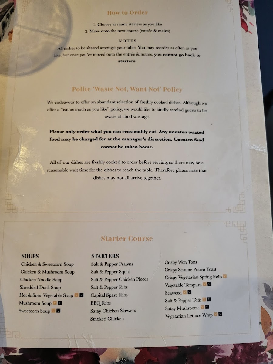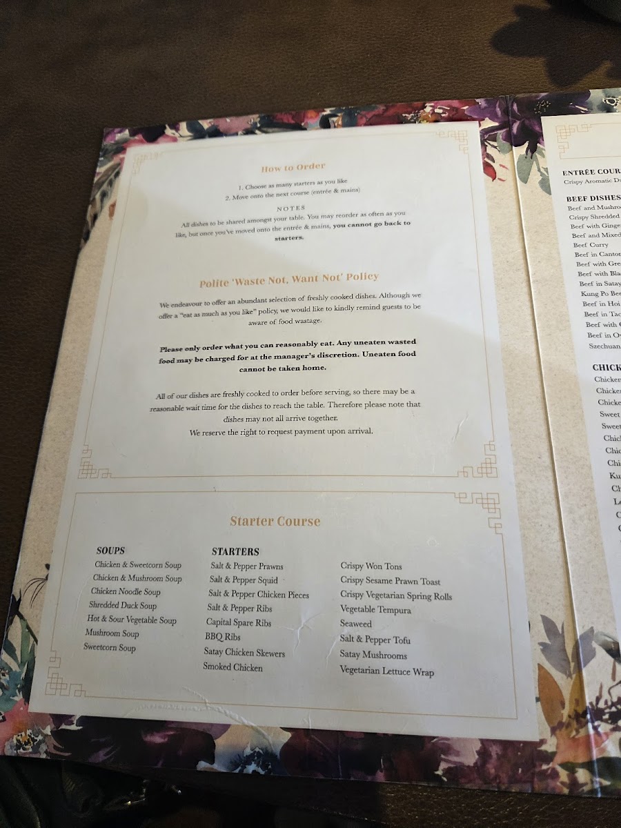 A standout feature of the menu is its “All You Can Eat” buffet-style ordering, served fresh to your table. Unlike conventional buffets, dishes are cooked to order, ensuring freshness and consistency. Starters include crowd-pleasers like Crispy Aromatic Duck, Salt and Pepper Spare Ribs, and Sesame Prawn Toast, all executed with finesse and generous portions.